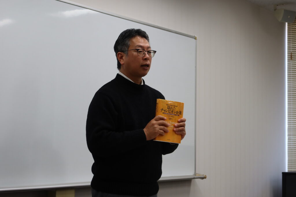 午後は大倉幹事長の講話からスタートしました。『グローバルビジネスの隠れたチャンピオン企業』に紹介されている、グローバルニッチトップ企業の特徴をもとに、私たち中小企業にとっても多くの示唆が得られる点や、ランチェスター戦略との共通項について分かりやすく解説いただきました。